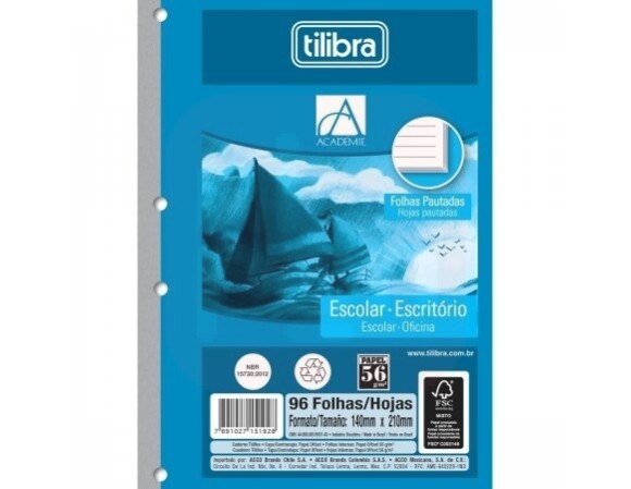 O Refil Tiliflex para Caderno Argolado 1/4 Académie possui folhas pautadas coladas.