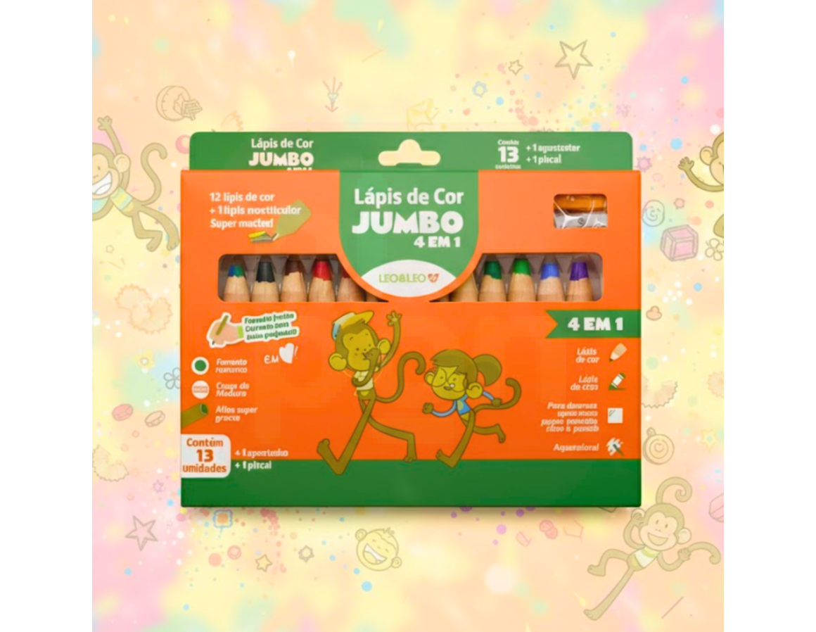 O Lápis de Cor Jumbo 13 Cores 4 em 1 - Leo&Leo é a escolha ideal para estimular a criatividade de crianças e artistas iniciantes. Com um design ergonômico e corpo mais grosso, é perfeito para mãos pequenas e proporciona maior controle e conforto na hora de desenhar. Seu grande diferencial está na tecnologia 4 em 1: funciona como lápis de cor, giz de cera, aquarela e lápis pastel, oferecendo versatilidade em um só produto. As cores são vibrantes, macias, de alta cobertura e fáceis de aplicar, garantindo uma experiência artística completa. Acompanha apontador especial, compatível com o formato jumbo.